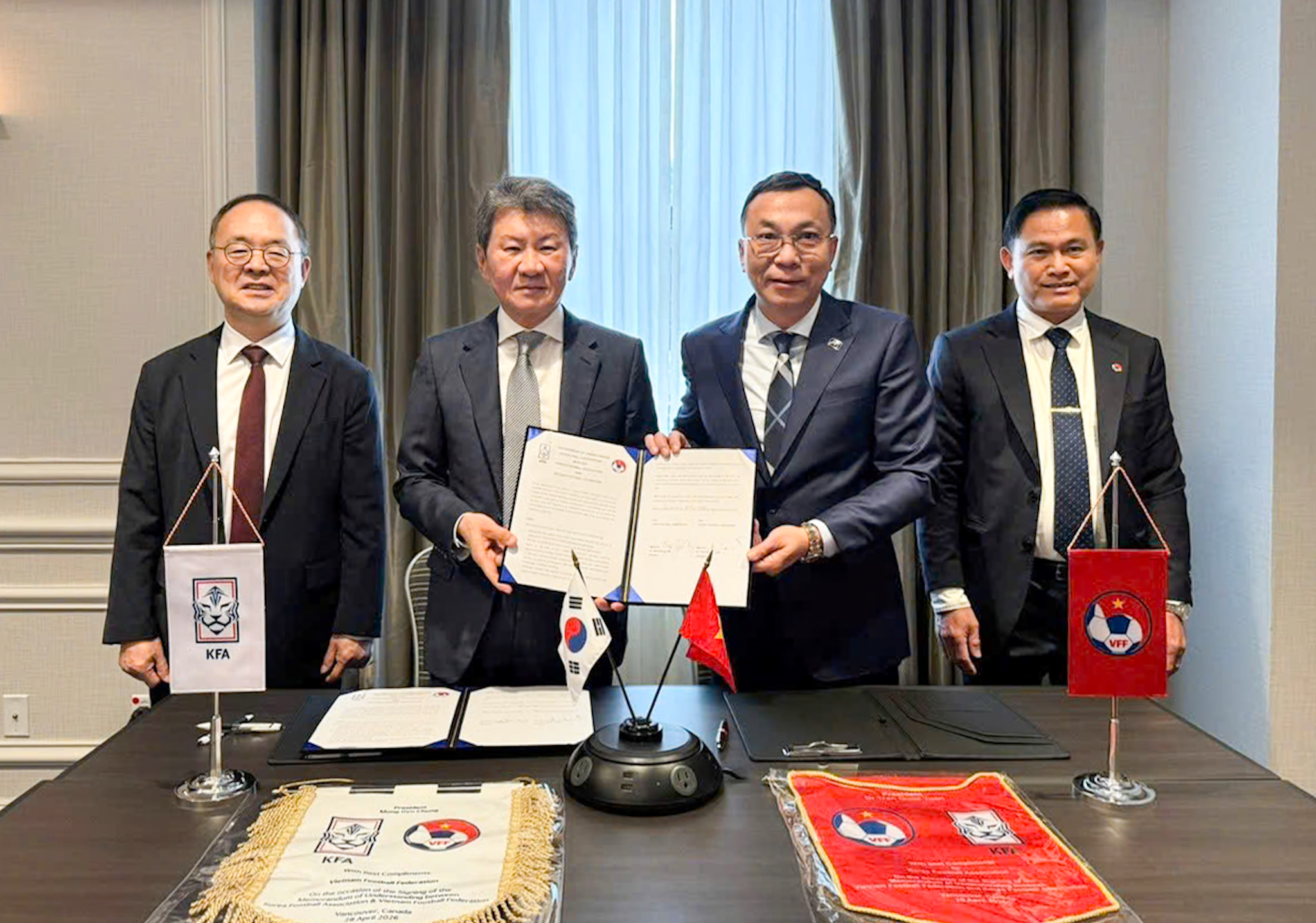 On April 28, 2026, in Vancouver, Canada, Vietnam Football Federation President Trần Quốc Tuấn and Korea Football Association President Chung Mong Gyu signed a Memorandum of Understanding (MoU) on cooperation in the new phase. The event took place on the eve of the 76th FIFA Congress, demonstrating their commitment to continue strengthening and expanding the cooperative relationship between the two football associations.